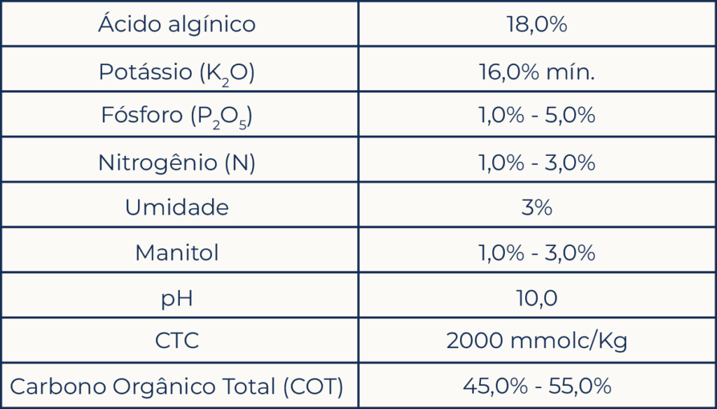 Extrato de algas marinhas extraídas da espécie Ascophyllum nodosum, 100% solúvel em água, apresentado em formato de flocos finos.