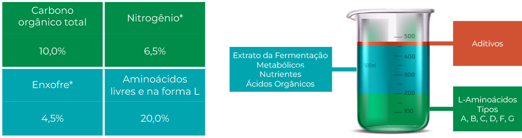 Fertilizante organomineral produzido em processo de biofermentação rigorosamente controlado associado a tecnologia exclusiva da inserção de L-aminoádicos biodisponíveis e de extratos metabólicos.
